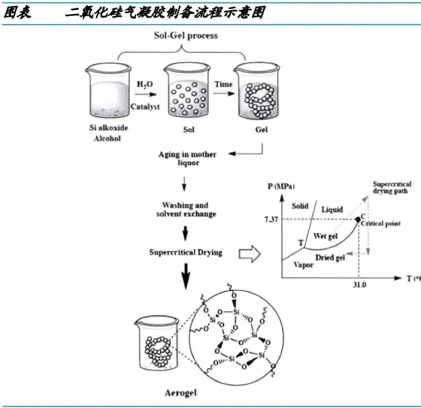 溶液-凝膠法成為主流工藝,干燥環(huán)節(jié)是關(guān)鍵步驟。SiO2氣凝膠通常采用溶膠-凝膠法進(jìn)行制備:首先選擇合適的硅源和催化劑,并讓硅源在催化劑條件下進(jìn)行水解,水解產(chǎn)物中攜帶的羥基基團(tuán)進(jìn)行縮合反應(yīng)后形成溶膠,溶膠粒子以鏈狀結(jié)構(gòu)組成粒子團(tuán)簇,在容器中形成濕凝膠,最后通過干燥工藝將濕凝膠中的水分或溶劑除去,即可制得干凝膠,也稱為氣凝膠。制備過程中硅源的類型、催化劑的性能、以及干燥工藝的選擇,都是影響SiO2氣凝膠結(jié)構(gòu)與性能的重要因素。