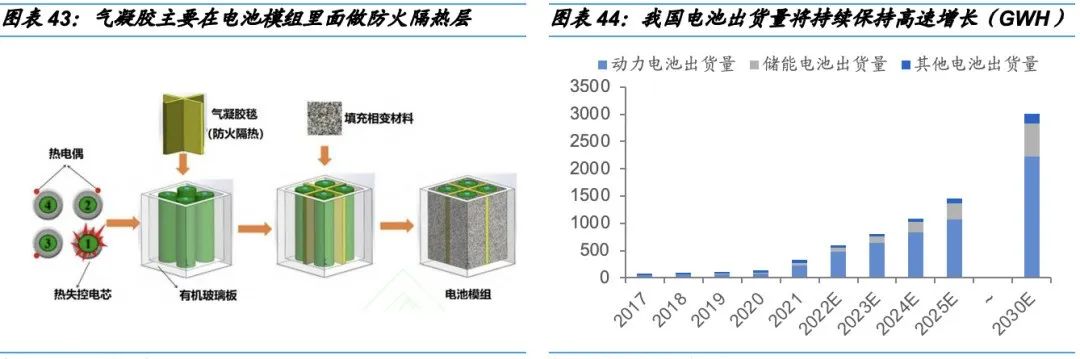 電池安全性要求帶動(dòng)隔熱材料需求持續(xù)提升。伴隨電池包對于安全性能要求的進(jìn)一步提升,氣凝膠作為更高端的隔熱材料可以大幅提升電池的安全性能,因而在電池應(yīng)用中不斷滲透,其中三元電池的壓實(shí)密度更高,續(xù)航里程更長,對于安全性的要求使得相關(guān)電池包生產(chǎn)過程中逐步選用更為高端的氣凝膠材料,滲透率不斷提升,而其他的磷酸鐵鋰動(dòng)力電池以及儲能電池領(lǐng)域也有逐步切入,一方面伴隨下游的電池出貨量的不斷提升,作為PACK隔熱材料的氣凝膠應(yīng)用將隨之提升,同時(shí)伴隨成本的管控和滲透率的提升,氣凝膠的應(yīng)用占比也將進(jìn)一步增大,預(yù)期新能源電池也將帶動(dòng)氣凝膠需求的快速放量,成為除建筑領(lǐng)域的另一大潛力市場。