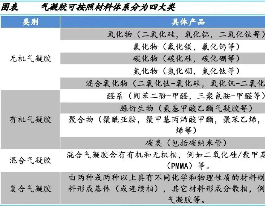 材料體系多樣化發(fā)展,下游應(yīng)用領(lǐng)域廣泛。按照材料的不同可將氣凝膠分為無機(jī)氣凝膠、有機(jī)氣凝膠、混合氣凝膠以及復(fù)合氣凝膠四大類,根據(jù)各自具備的性質(zhì)對應(yīng)下游航空航天、工業(yè)設(shè)備、石油化工、建筑管道等應(yīng)用領(lǐng)域。其中無機(jī)氣凝膠的SiO2氣凝膠作為一種防火隔熱性能非常優(yōu)秀的輕質(zhì)納米多孔非晶固體材料,是目前生產(chǎn)技術(shù)及商業(yè)化應(yīng)用最為成熟的產(chǎn)品具有低密度、低導(dǎo)熱系數(shù)、高孔隙率、高比表面積等優(yōu)異性能,在管道保溫隔熱、隔熱涂料、節(jié)能玻璃、管道防腐、吸附催化等領(lǐng)域具有廣泛的應(yīng)用前景。