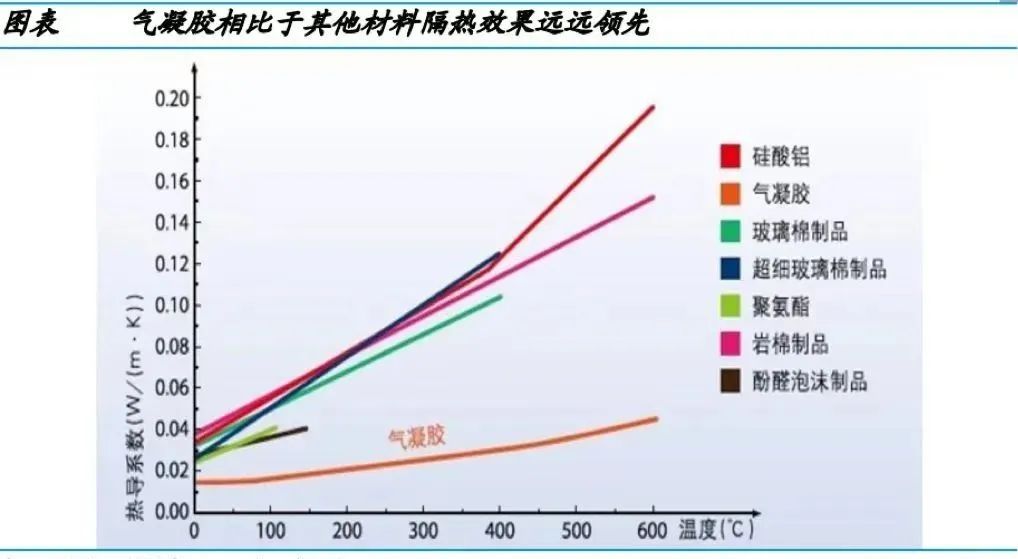 內(nèi)部結(jié)構(gòu)獨(dú)樹一幟,隔熱性能尤為突出。氣凝膠材料具有低密度、比表面積大、孔隙率高等特點(diǎn),具有耐高溫、低熱導(dǎo)率、低折射率和低聲傳播速度等特殊的熱、光、電、聲性能。依賴于自身獨(dú)特的結(jié)構(gòu),氣凝膠通過無對流效應(yīng)、無窮遮擋效應(yīng)以及無窮長疏松路徑效應(yīng)具備了遠(yuǎn)超硅酸鋁、玻璃棉等傳統(tǒng)隔熱材料的隔熱性能。因而在具有極高的隔熱要求,且需要輕度較低,穩(wěn)定性較好的應(yīng)用領(lǐng)域,氣凝膠是極佳的應(yīng)用材料。