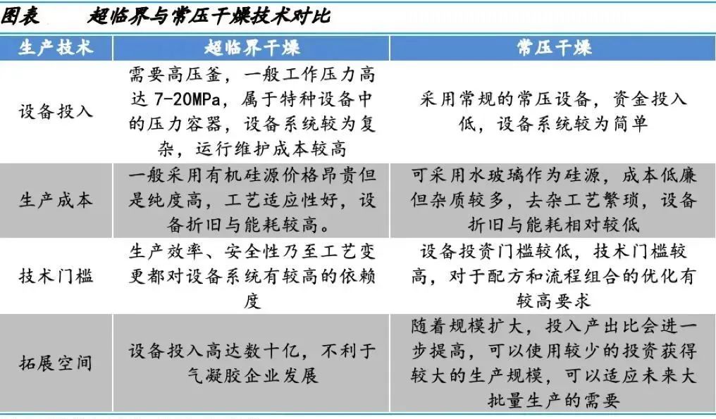 干燥工藝:干燥工藝是SiO2氣凝膠由濕凝膠向干凝膠轉(zhuǎn)變的關(guān)鍵步驟。干燥工藝要求在除去濕凝膠網(wǎng)絡(luò)結(jié)構(gòu)中填充的溶劑的同時(shí),還要保持其網(wǎng)絡(luò)結(jié)構(gòu)不被破壞,目前工業(yè)化生產(chǎn)中主要使用超臨界干燥技術(shù)和常壓干燥技術(shù)。一般情況下,超臨界干燥技術(shù)往往選擇有機(jī)硅作為硅源進(jìn)行生產(chǎn),設(shè)備投資與能耗均高于常壓干燥技術(shù),但是產(chǎn)品純度相對較高。