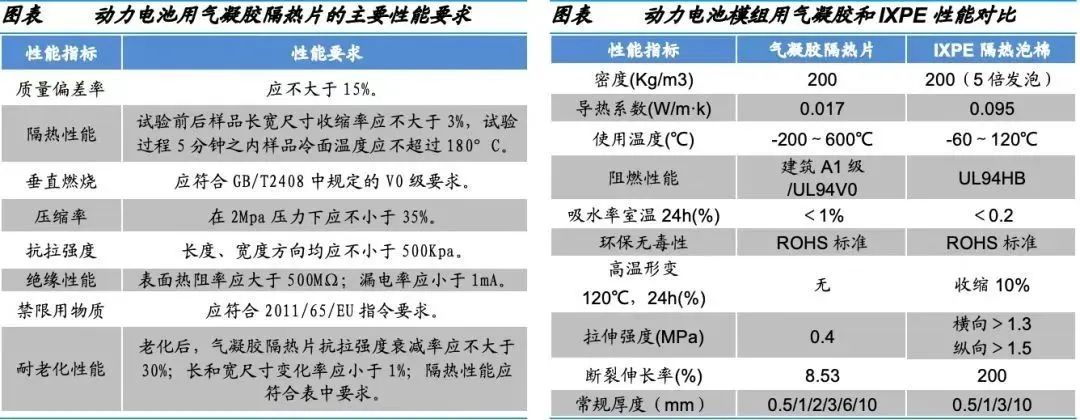 現(xiàn)階段新能源汽車主要以鋰離子電池作為動(dòng)力電池,而極端條件下熱失控是新能源汽車動(dòng)力電池的重大安全隱患。氣凝膠隔熱材料在新能源汽車領(lǐng)域主要應(yīng)用于動(dòng)力電池電芯之間的隔熱阻燃以及模組與殼體之間的隔熱防震、電池箱的外部防寒層和高溫隔熱層,從而更好地實(shí)現(xiàn)電池的溫控和電控管理,大幅降低電池發(fā)生熱失控的可能性。與傳統(tǒng)的IXPE隔熱泡棉相比,氣凝膠隔熱片在使用溫度、導(dǎo)熱系數(shù)、阻燃性能等多方面核心指標(biāo)具有明顯優(yōu)勢。