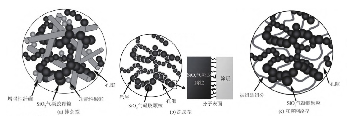 二氧化硅氣凝膠復(fù)合材料可分為4大類:摻雜型硅基氣凝膠復(fù)合材料、涂層型硅基氣凝膠復(fù)合材料、互穿網(wǎng)絡(luò)型硅基氣凝膠復(fù)合材料以及組合型硅基氣凝膠復(fù)合材料,微結(jié)構(gòu)示意見圖2。組合型硅基氣凝膠絕熱復(fù)合材料是將第二相材料以摻雜、涂層或互穿網(wǎng)絡(luò)的形式組合在一起,以發(fā)揮3種復(fù)合改性材料的優(yōu)點(diǎn),克服缺點(diǎn),形成綜合性能更佳、適用性更好的復(fù)合材料。