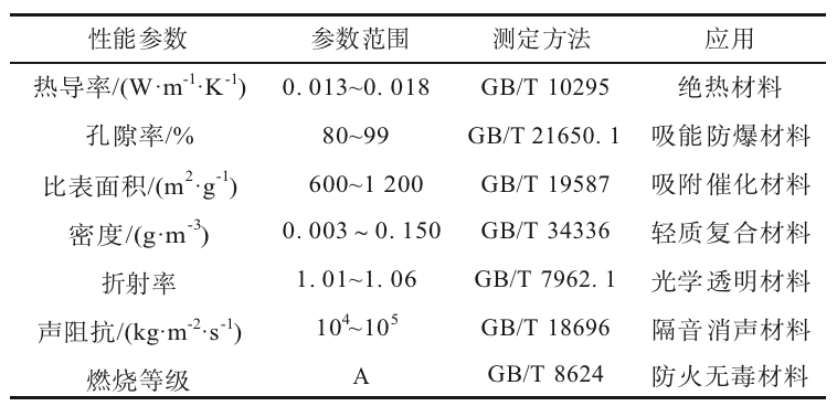 表1 二氧化硅氣凝膠的典型性能參數(shù)及應(yīng)用
