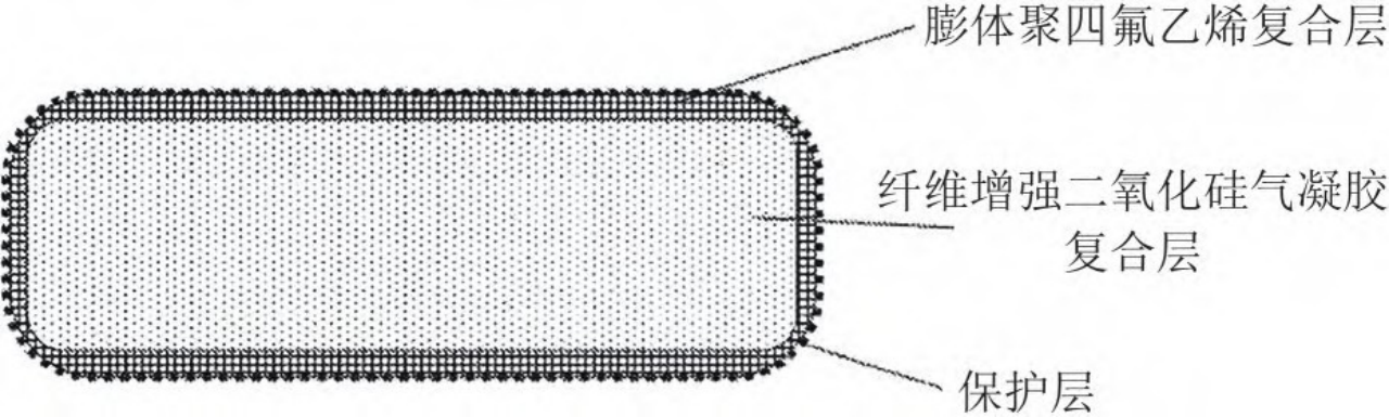 二氧化硅氣凝膠與玻璃纖維、陶瓷纖維或者碳纖維等復(fù)合后得到氈類制品,雖隔熱效果較好,但是表面纖維容易斷裂、粉化,造成浮纖或粉末污染。為解決該問題,可將氣凝膠復(fù)合層的外部覆蓋一層更高強(qiáng)度、高韌性的材料,如膨體聚四氟乙烯和阻燃聚對苯二甲酸乙二醇酯纖維的復(fù)合層,如圖7 所示。