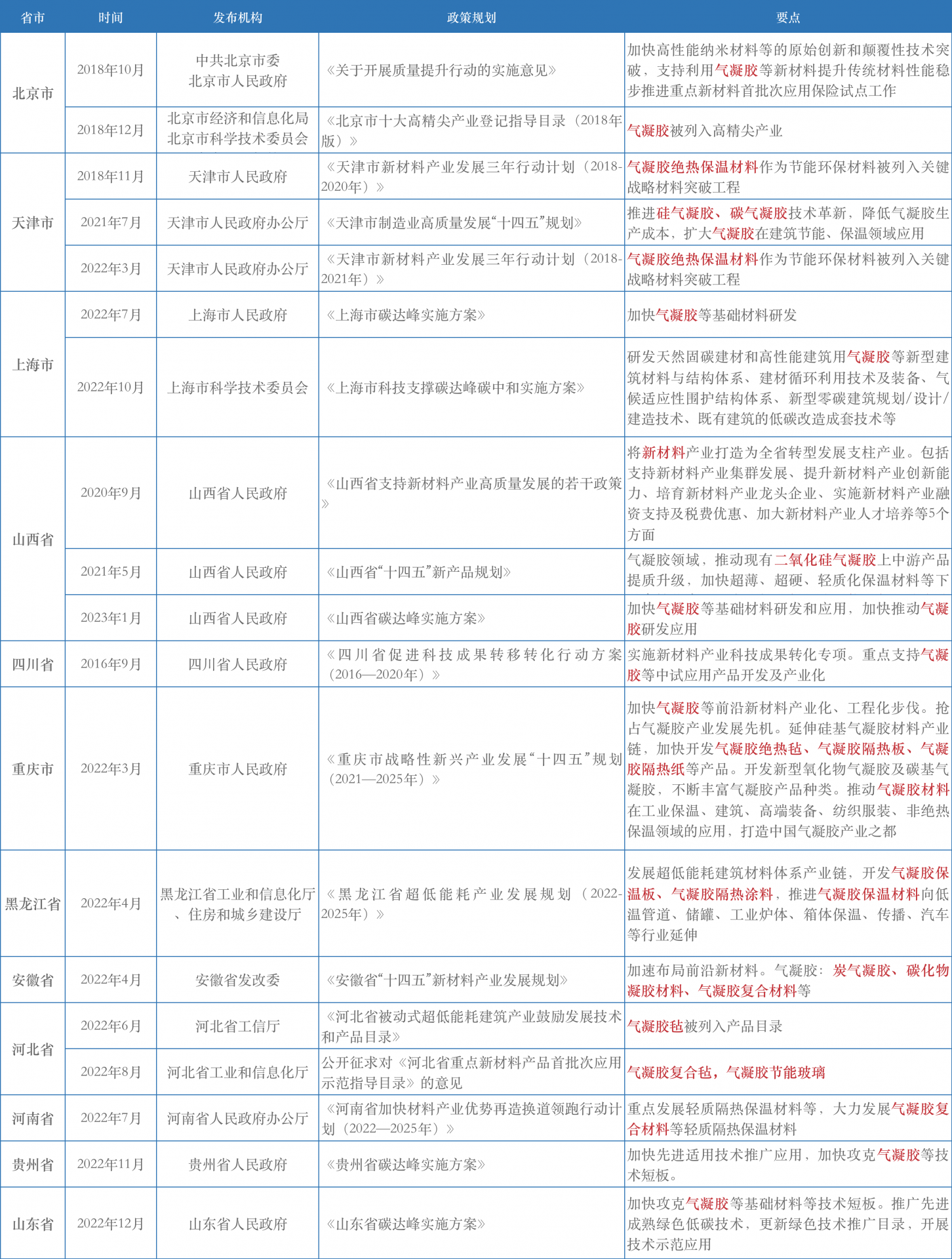 部分省市氣凝膠行業(yè)相關(guān)政策
